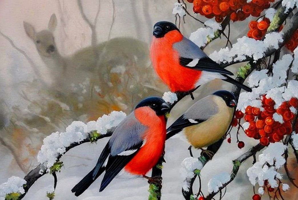 На рябине (что делала?, пр. вр.) лакомилась стайка снегирей.